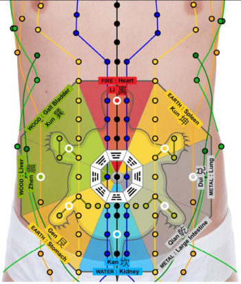 Abdominal Microsystem Acupuncture is based on Traditional Chinese Medicine (TCM) Meridian theory and operates through a treatment area on the abdomen that embraces the Meridians, a Turtle reflex microsystem and a Bagua microsystem, giving unique access to the complex energetics of the human body. In Abdominal Microsystem Acupuncture most of the points are connected by Meridians to provide links into all the physiological mechanisms of the body.